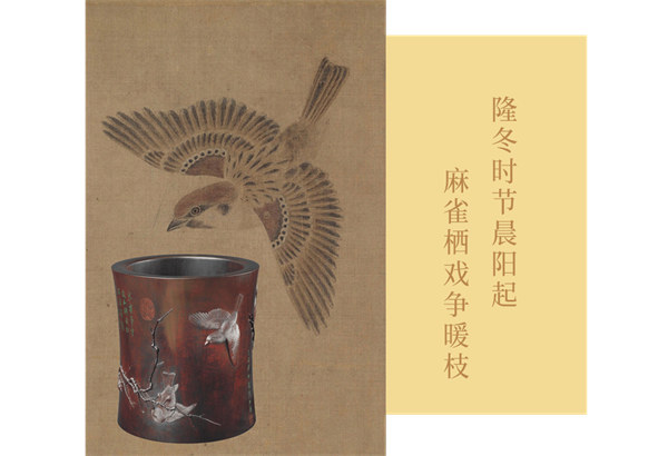泰和园设计师们从《寒雀图》中汲取灵感,创作出了一款别具一格的寒雀图笔筒。