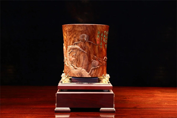 寒雀图笔筒的造型简约而不失雅致,线条流畅自然。表面雕刻的寒雀形象栩栩如生,每一只寒雀都各具姿态,或飞或立,或鸣或静,仿佛在向人们诉说着它们的故事。