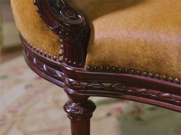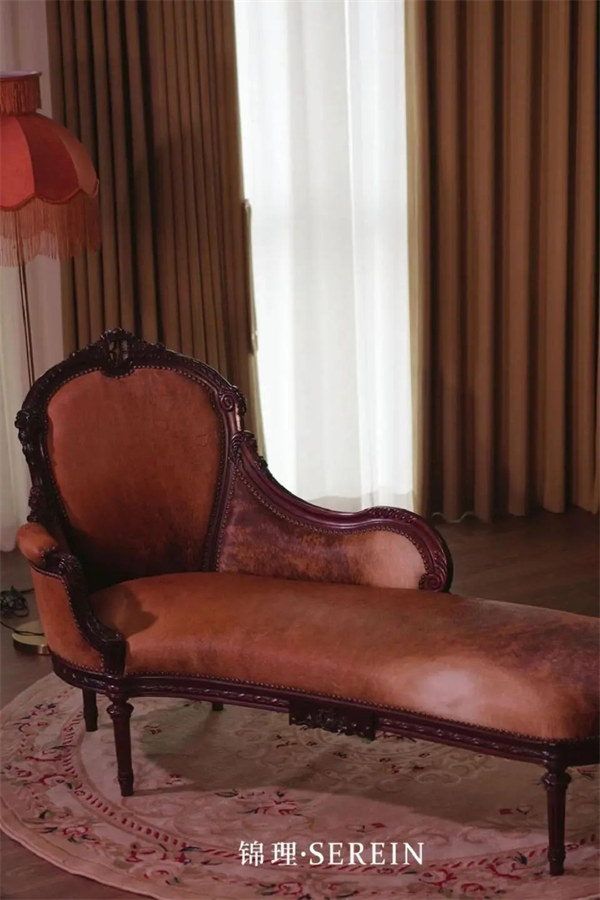 一面是中式红木的精雕细琢,另一面则是法式洛可可风格的浪漫图案,螺状纹饰与波浪曲线交织,营造出一种无与伦比的视觉盛宴。而榻上覆盖的稀有马皮,更是为这份奢华增添了一抹自然与舒适的触感,让人在休憩之余,也能感受到老派贵族的典雅与风范。