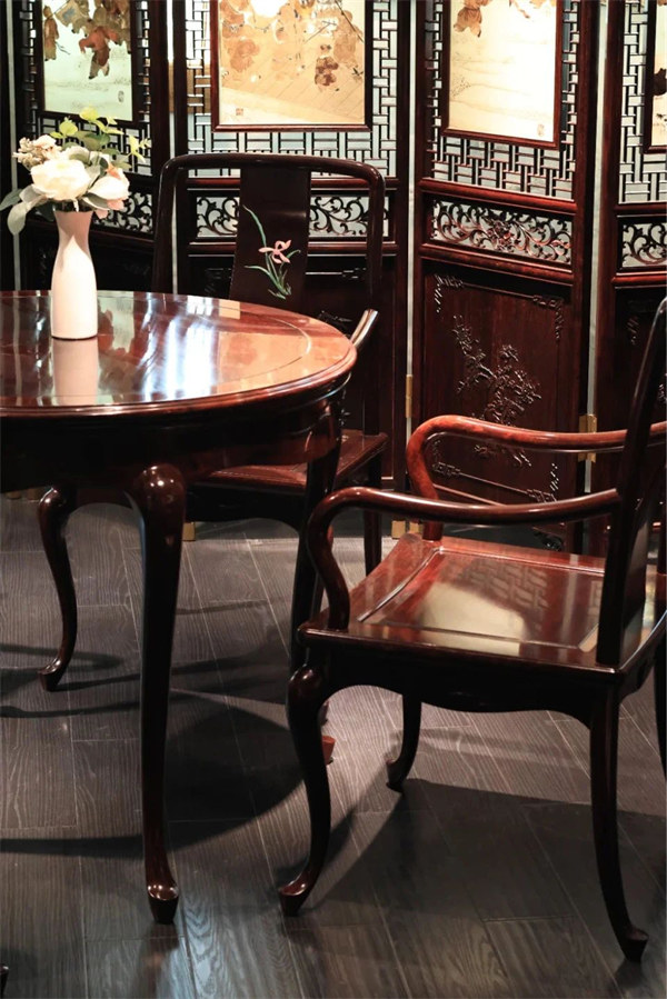 红木家具以贵妃榻、兰花椅柔美舒适的姿态赞美了女性之美,以屏风营造私密而艺术的家居氛围,以妆匣承载女性对美的追求与自我表达。