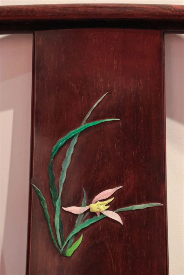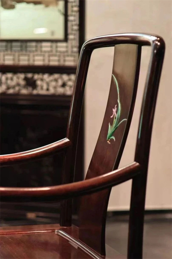 S型背板线条流畅而柔美,仿佛是山间清风拂过,带着兰花特有的清逸。每一道曲线,每一朵形态各异的兰花,都经过精心绘制,秀美纤巧,自然清雅,令人赏心悦目。