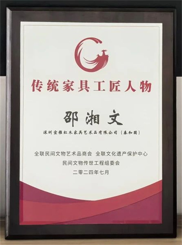 邵湘文大师凭借深厚的文化底蕴与对工艺的执着追求,带领团队创造出众多获得国家专利的红木家具艺术精品,部分作品更被中国国家博物馆收藏。