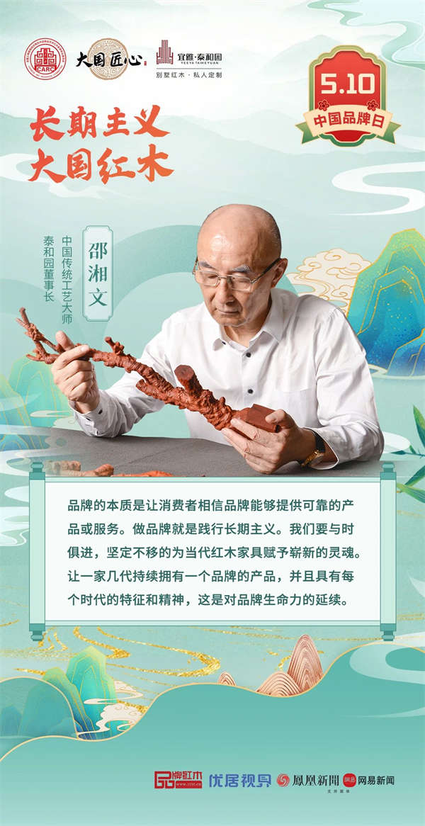5月10日正值第八个中国品牌日。为此,中国传统工艺大师、泰和园董事长邵湘文致敬中国品牌日:“做品牌就是践行长期主义。我们要与时俱进,坚定不移的为当代红木家具赋予崭新的灵魂。能让一家几代持续拥有一个品牌的产品,并且具有每个时代的特征和精神,这是对品牌生命力的延续。”