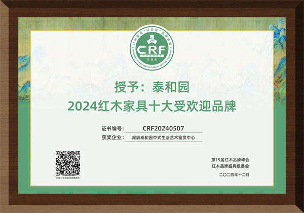 12月18日,第15届红木家具品牌峰会在青岛举行,在全国红木家具行业领导、产区领导、权威专家与业界精英的见证下,泰和园以卓越的成就斩获“2024红木家具十大受欢迎品牌”。