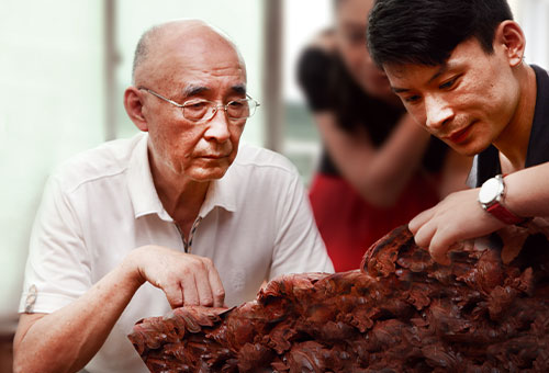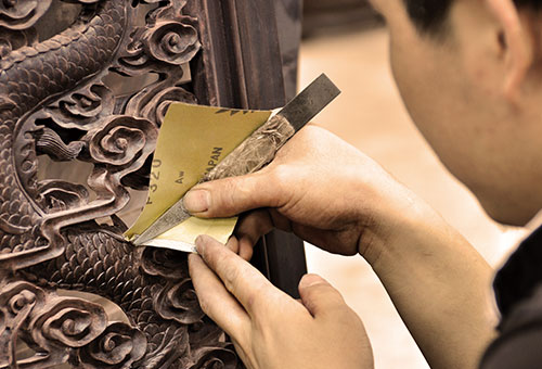 传统的雕刻包括打胚、修光和刮磨三道工序,泰和园的丝翎檀雕给工序又增加了丝毛这一道。我们对雕刻的要求不仅仅是形似,更要神似。为了达到艺术品的质感,我们大大加强了刮磨的工时。在传统10:5的木工和刮磨工的配比上,我们做到了10:30。因此,我们的所有的雕刻面均有着平面同等的平整度和光润感。