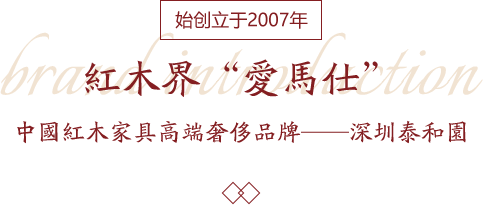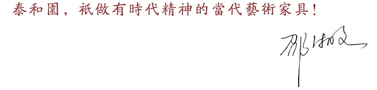 泰和园高度尊重和珍视自己的品牌。坚持品牌定位,更继承了追求品质、精益求精的态度。以精致、品位、舒适的“时代哲学”为设计基础,力求为尊贵的顾客提供私人量身定制的高端服务。打造了如《翎檀家具书房系列》、《丝翎檀雕松鹤延年茶台》、《当代君子竹节椅》等系列创新艺术珍品。